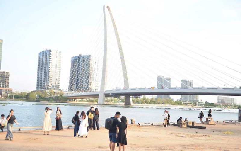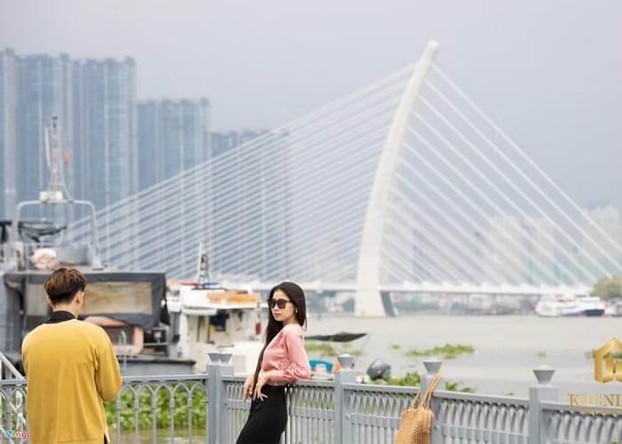Đứng trên cầu, bạn sẽ lấy được toàn cảnh những tòa nhà chọc trời của Quận 1 như Bitexco hay các khách sạn cao cấp ven sông. Những dây văng trắng muốt của cầu chính là “phụ kiện” trang trí tuyệt vời nhất. Mẹo: Hãy chọn góc chụp nghiêng để vừa thấy dây văng, vừa thấy dòng sông Sài Gòn mênh mông phía sau.