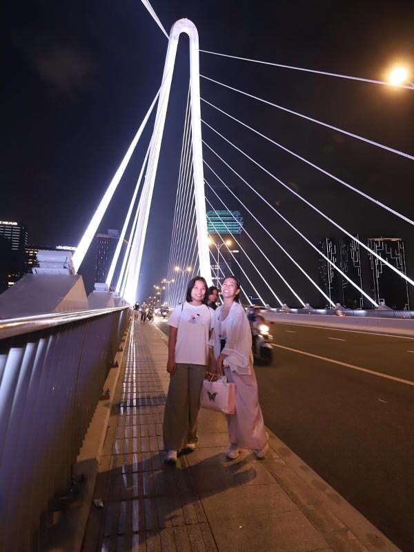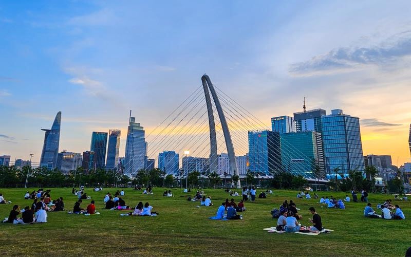 Bên cạnh đó, cầu sở hữu view “panorama” ôm trọn những biểu tượng xịn xò nhất: một bên là Landmark 81 sừng sững, một bên là Bitexco và những tòa nhà hiện đại quận 1. Chỉ cần đứng vào khung hình, bạn đã có ngay một background mang đậm hơi thở của một “Singapore thu nhỏ” giữa lòng Sài Gòn.