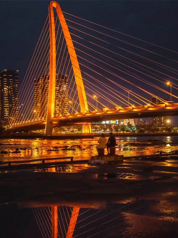 Khi mặt trời hoàn toàn khuất dạng, cầu Ba Son khoác lên mình “chiếc áo” ánh sáng lộng lẫy. Với hệ thống đèn LED đổi màu hiện đại, cây cầu như một dải lụa rực rỡ vắt ngang sông.