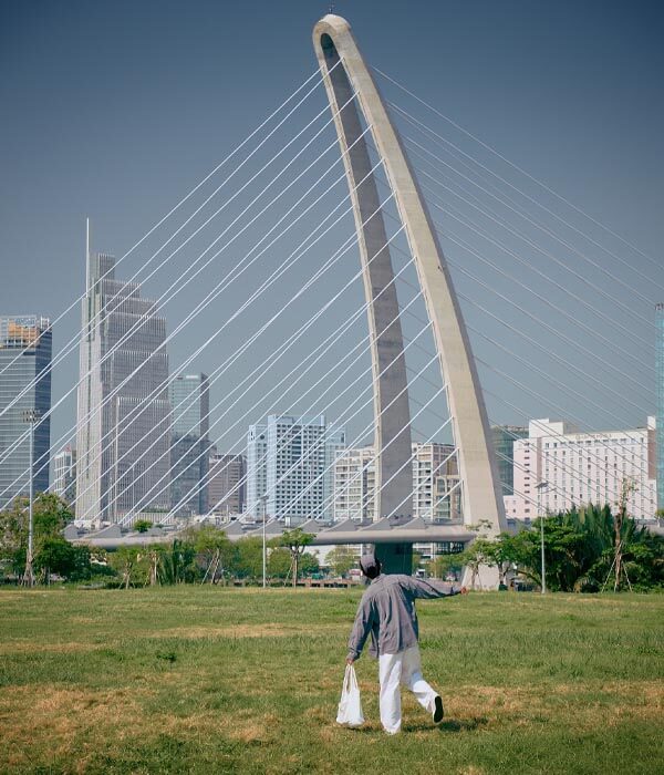 Nằm ngay dưới chân cầu phía Thủ Thiêm, góc này giúp bạn lấy được toàn bộ dáng vẻ uy nghi, hiện đại của cây cầu từ dưới nhìn lên. Không gian ở đây rộng rãi, thoáng đãng với nhiều mảng xanh. Mẹo: Chụp từ dưới lên (low-angle) để cây cầu trông hùng vĩ và “quyền lực” hơn.